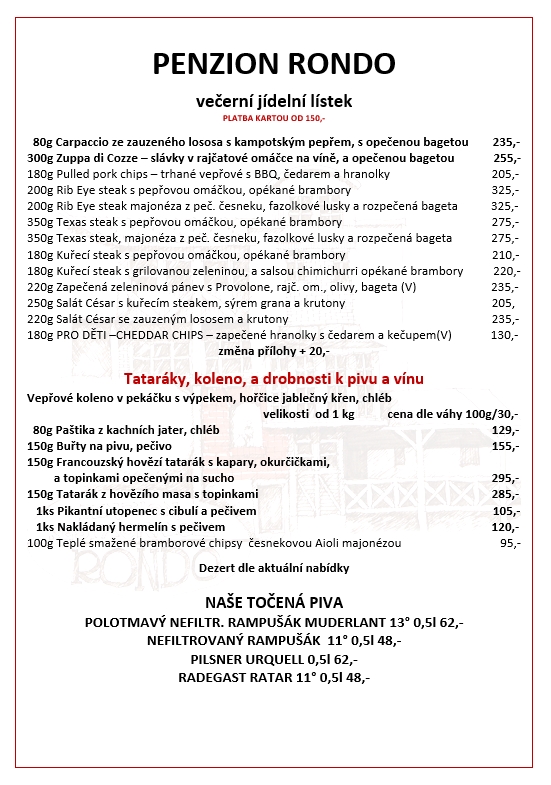 Restaurace penzionu Rondo má vnitřní a vnější část. Zahrádka je obklopená příjemnou přírodou a v letní sezóně je proto vyhledávaným místem k relaxaci.